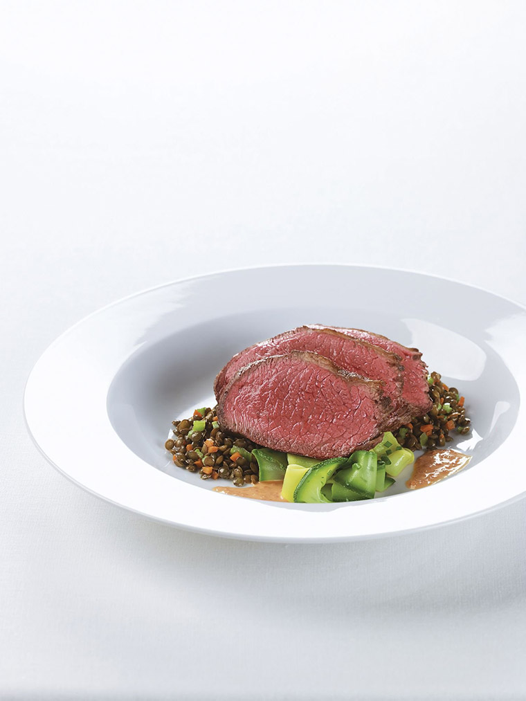 Pour 85g of lentils onto the bottom of the plate. Place the zucchini on top of the lentils and drizzle with red pepper bordelaise sauce. Slice the beef across the grain and lay over the zucchini.