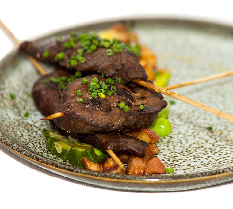 For the beef: In a large bowl, combine marinade, pour over meat and refrigerate for 2 hours. Using soaked skewers, pierce 56g portion of marinated flank steak and grill until desired doneness.