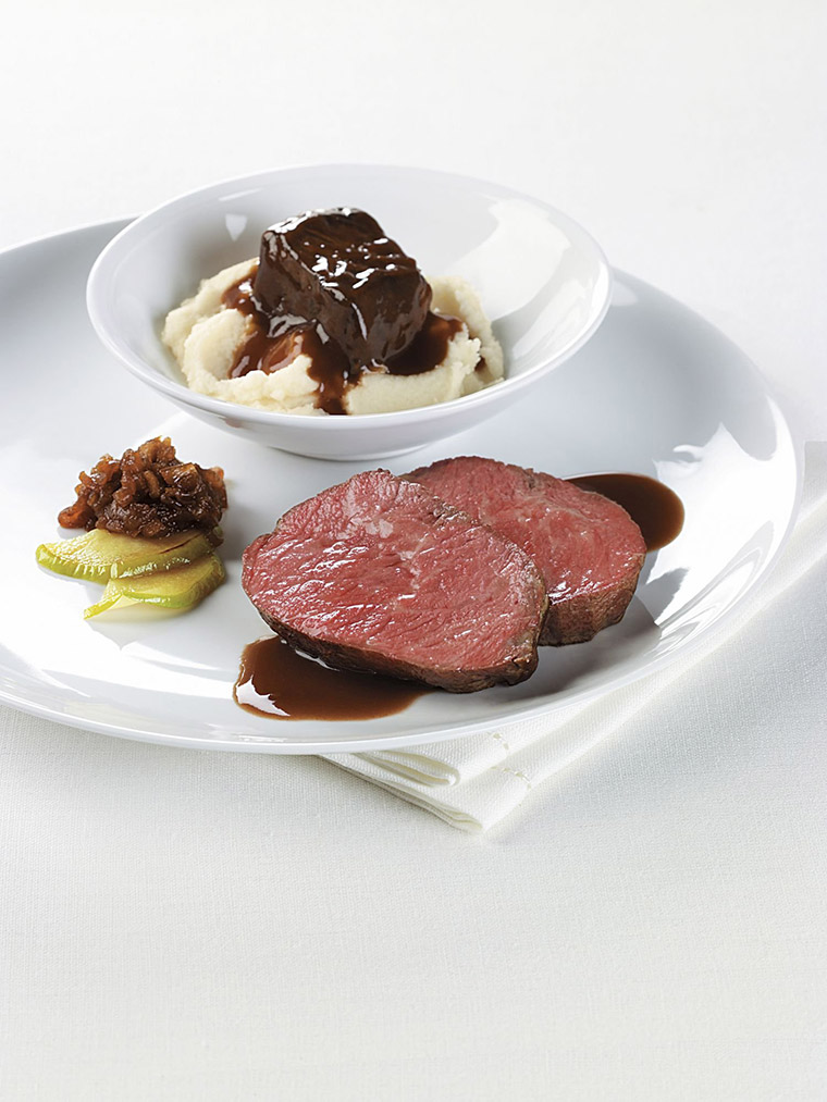 Got wholesale beef? Try this Medallion of Aussie Striploin and Braised Beef Shortribs on Cauliflower Puree and Apple and Spanish Onion Jam.