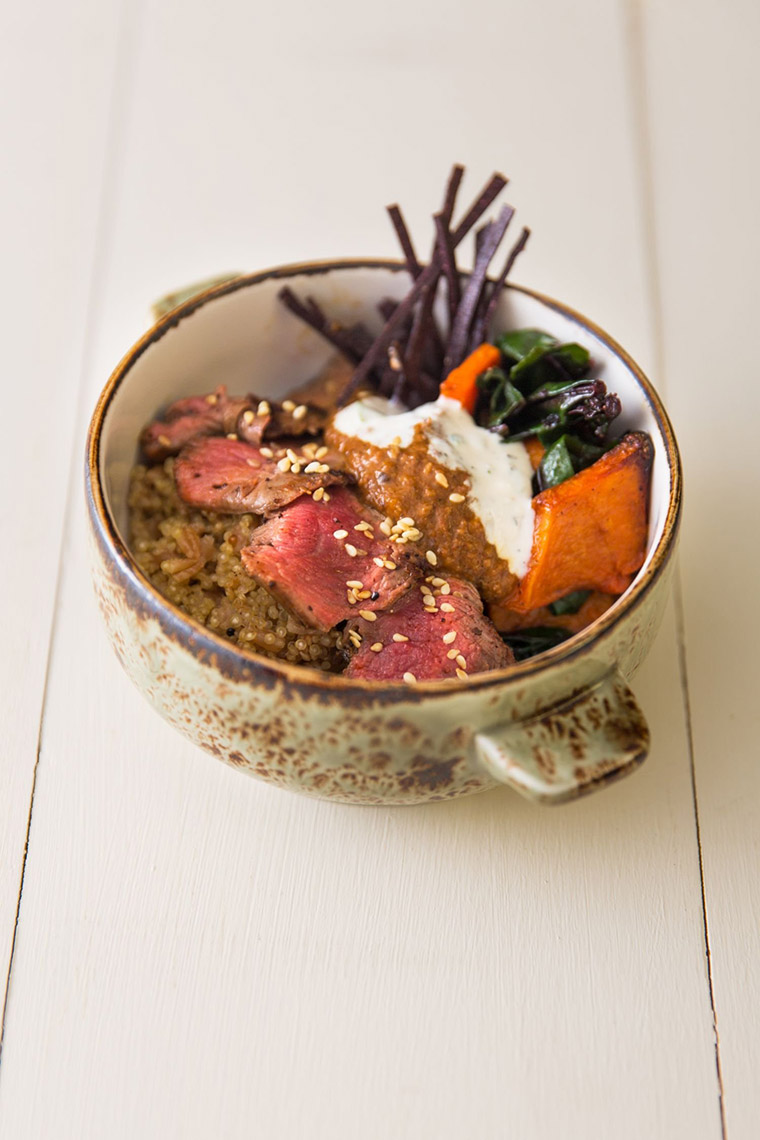 Grassfed beef, a supergrains porridge, peanut mole sauce, and savory greens and squash load up a ton of healthy-delicious cues in a convenient and customizable package.