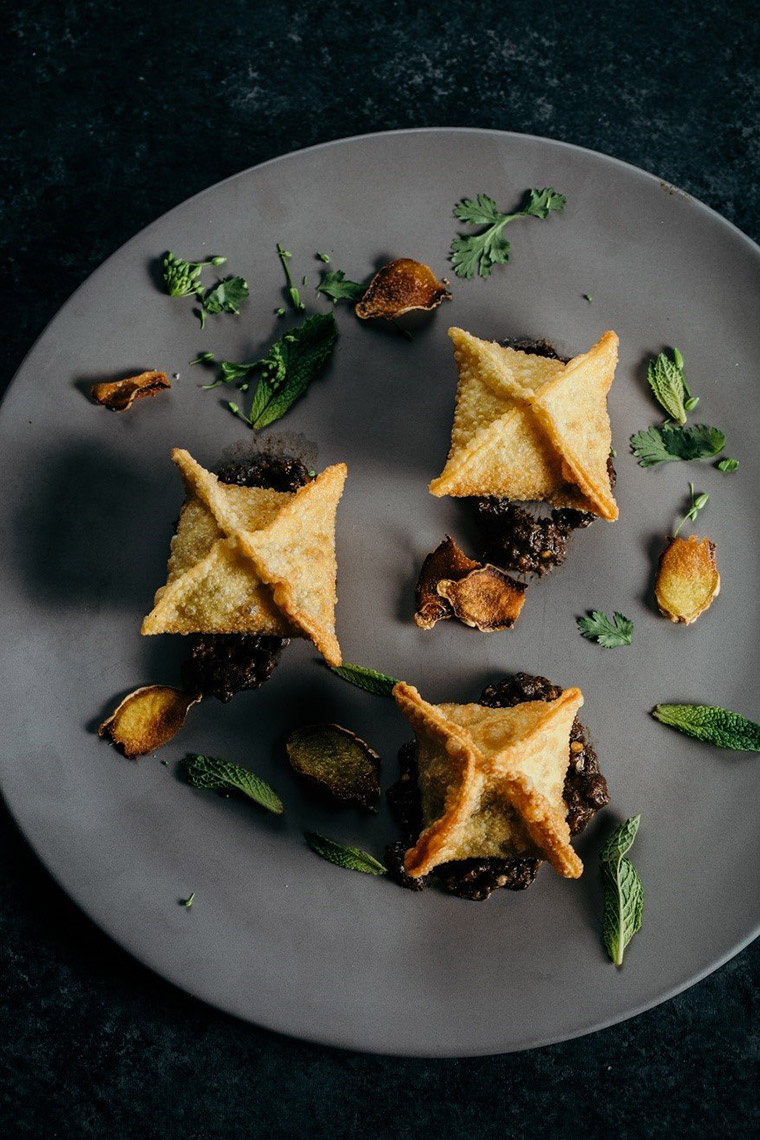 4. For each serving, fry four dumplings until golden. Make four dollops of eggplant puree on a plate and top each one with a dumpling. Scatter cilantro, mint, and garlic chips on the plate.
