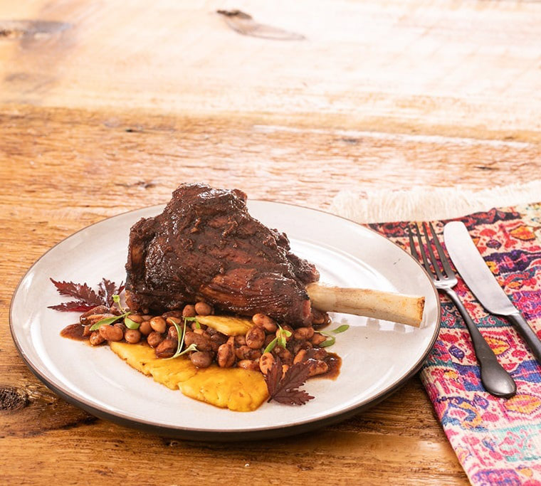 To prep: Char maguey leaves over grill, place leaves on sheet pan and line up lamb shanks to fill pan. Place pineapple and avocado leaves above shanks and wrap maguey leaves around them.