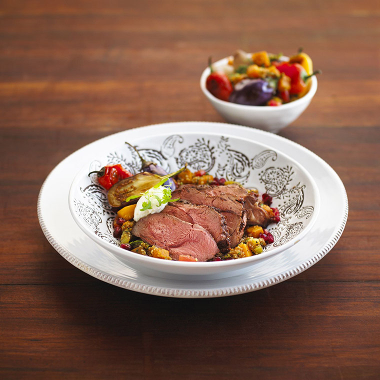Serve sliced lamb top sirloins with vegetable tagine, yogurt and pomegranate seeds.