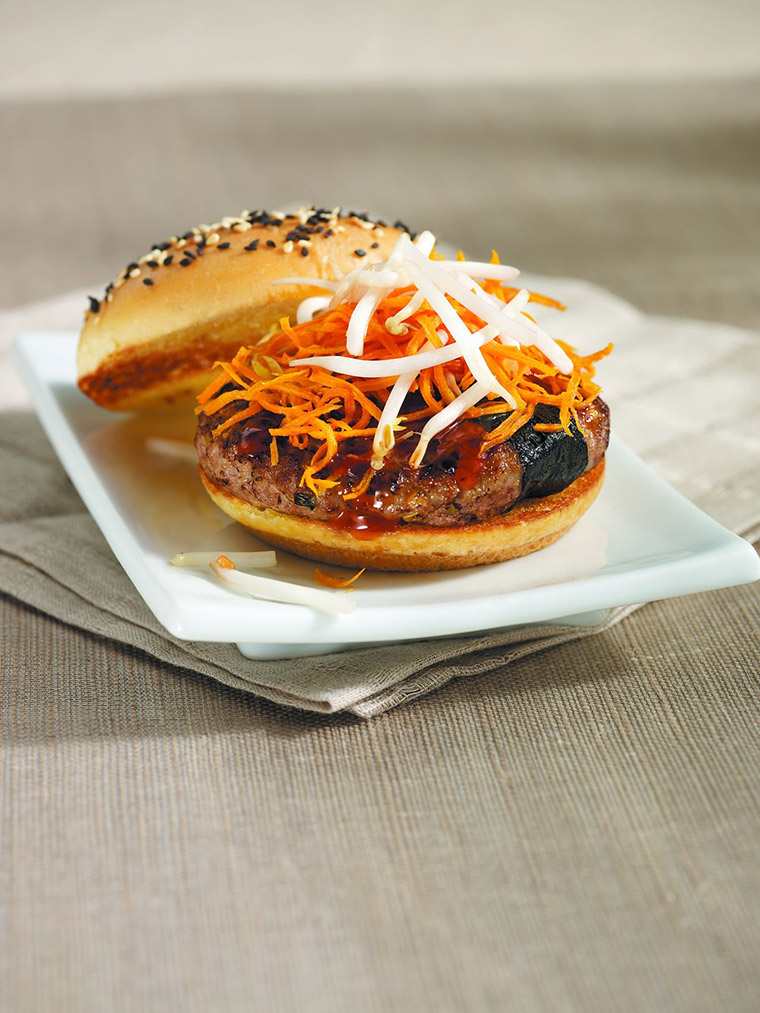 To Serve: Place burger on bun and top with sweet chili sauce, fried yam, mung bean sprouts and watercress. Finish with top bun and serve.