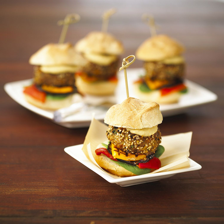 Spread a little hummus on the base of the bun and top with baby spinach leaves. Cover leaves with a Lamb slider, top with warm grilled vegetables and replace the crown. Serve warm for any occasion.