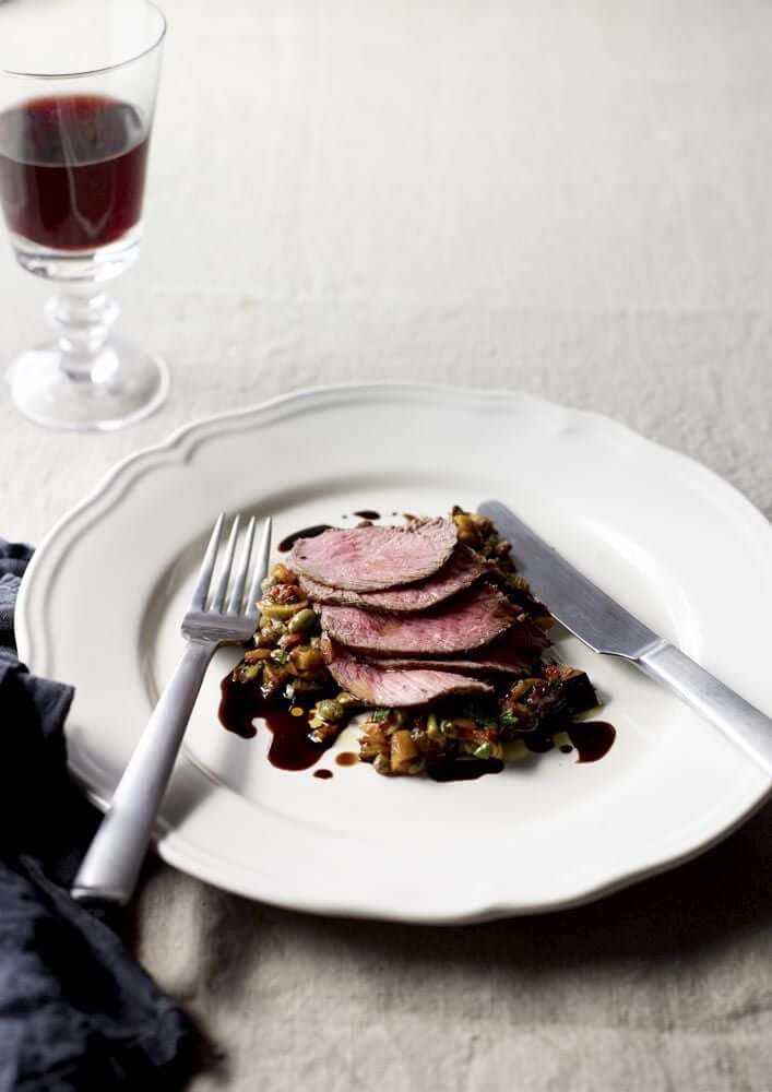 Serve with the caponata and drizzle with reduced lamb stock, balsamic vinegar and extra virgin olive oil.