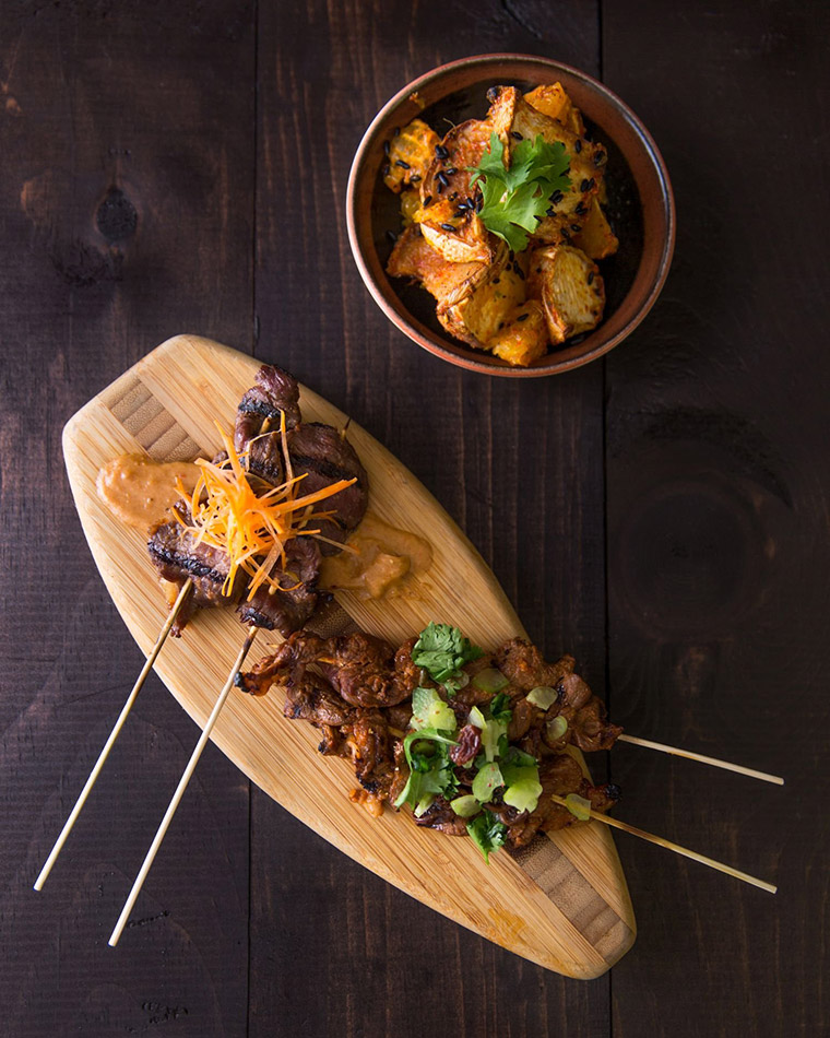 To serve: preheat a grill over HIGH heat. Grill skewers to 125 degrees F, about 6-7 minutes. Place cooked skewers atop coconut-peanut sambal with sake soaked raisins, fresh cilantro, celery leaves and shredded carrot.